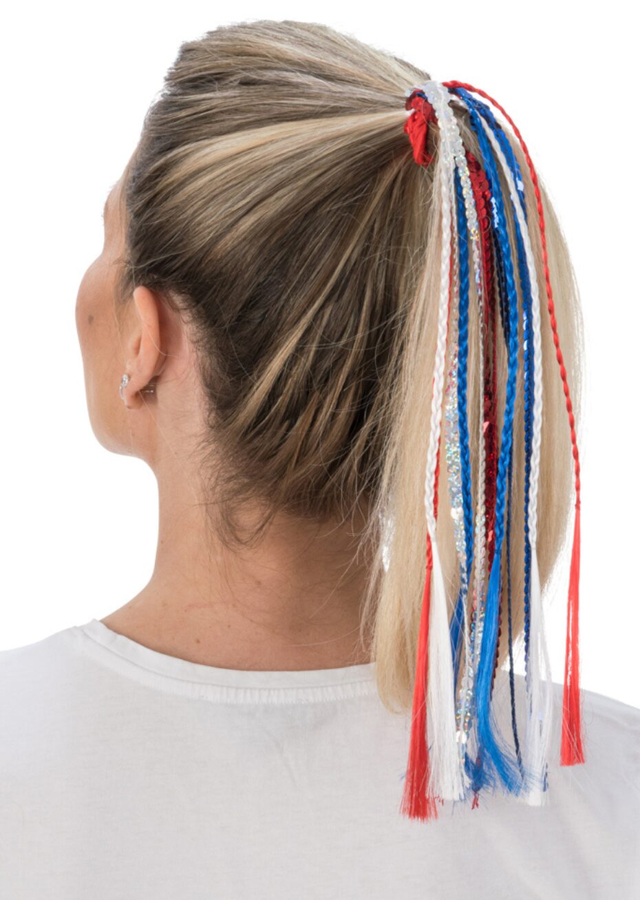 Ce chouchou bleu blanc rouge est agrémenté de longues tresses tricolores pour afficher les couleurs de la France de façon simple et festive. Facile à attacher autour d’une queue de cheval ou d’un chignon, il complète une tenue aux tons bleu, blanc et rouge sans effort. Léger et pratique, il convient aussi bien pour un match que pour une fête nationale ou un événement sportif.