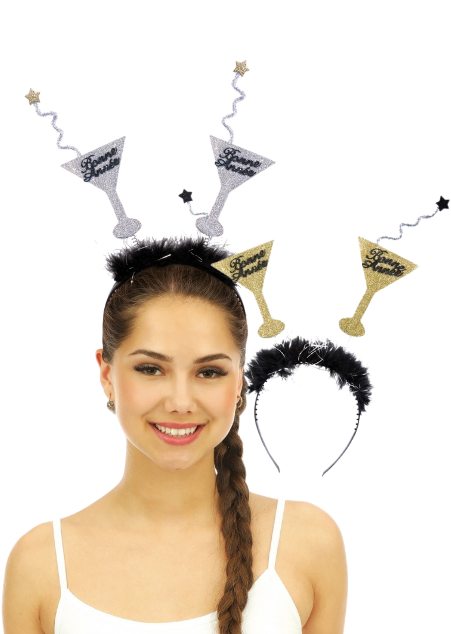 Ce serre tête Bonne Année se distingue par ses tiges souples surmontées de motifs en forme de coupe à cocktail et d’étoiles, avec l’inscription “Bonne Année”. Disponible en version argent ou dorée, il est super festif pour célébrer le passage à la nouvelle année. Léger et confortable, il ajoute un élément amusant aux photos de fête.