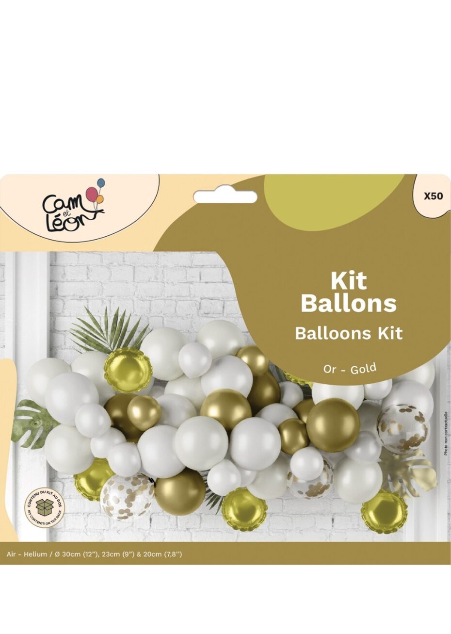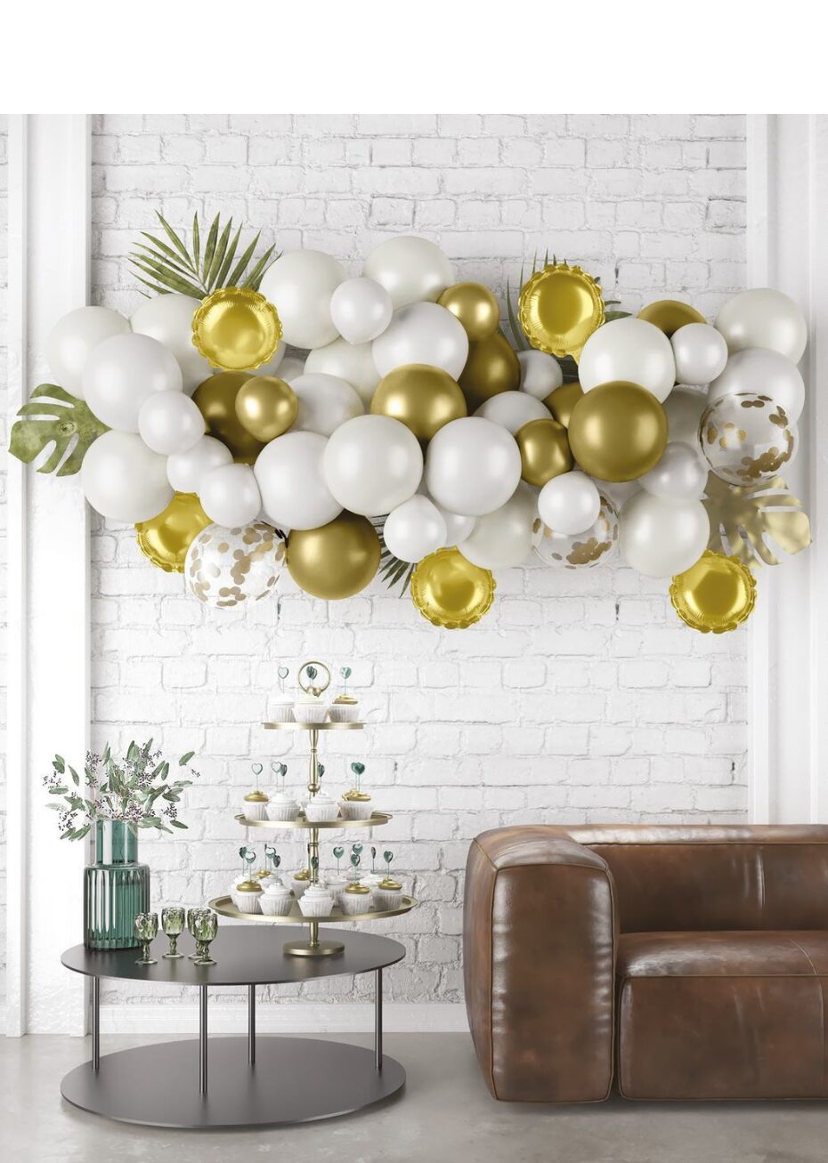 Cette guirlande de ballons blancs et or permet de créer une décoration élégante et lumineuse pour un événement. Le kit complet permet de réaliser facilement une décoration pour un mur, un candy bar ou un espace photo. L’association du blanc et du doré est idéale pour un mariage, un anniversaire, un baptême ou une fête chic. Le kit se compose de 50 ballons : 5 aluminiums, 15 ballons de 23 cm et 30 ballons de 30 cm. Vous pourrez réaliser une guirlande ou utiliser les ballons séparément en bouquets ou dispersés. Les ballons peuvent être gonflés à l’air ou à l’hélium.