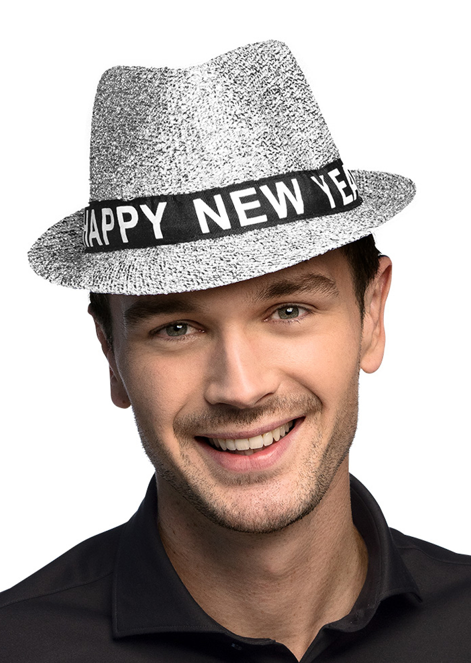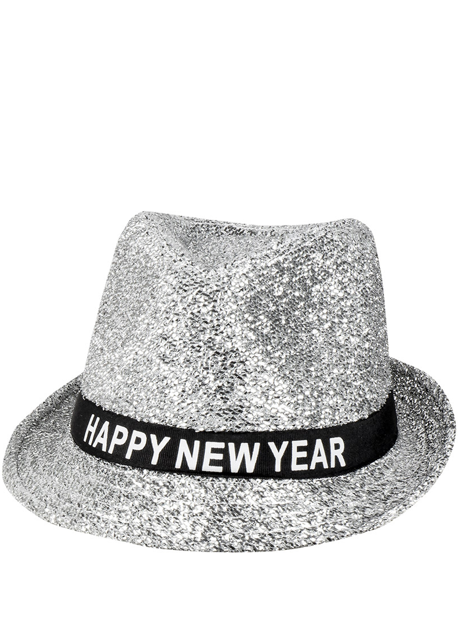 Ce chapeau nouvel an argent se distingue par son fini ultra brillant et son ruban noir avec inscription Happy New Year. Léger et agréable à porter, il a une forme élégante inspirée du style borsalino, idéale pour compléter une tenue de réveillon. Cet accessoire sobre et festif est parfait pour une soirée de réveillon.