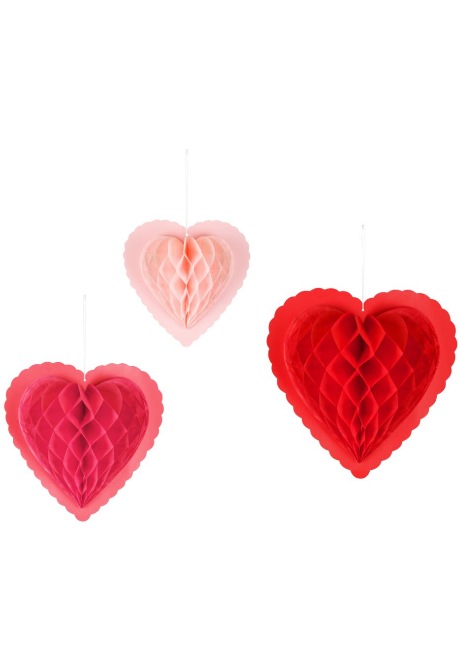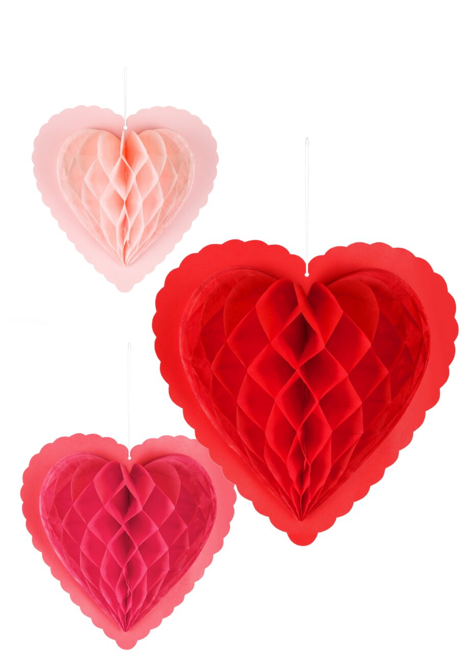 Ces décorations en papier alvéolé sont des cœurs déclinés en 3 tailles et nuances de rouge et de rose pour créer un ensemble harmonieux. Leur structure alvéolée donne du volume tout en restant légère. Chaque cœur se suspend facilement et se monte en quelques gestes, pour une mise en place rapide et modulable selon l’espace disponible. Parfait pour décorer une chambre ou une entrée, en permanent ou pour une fête à thème.