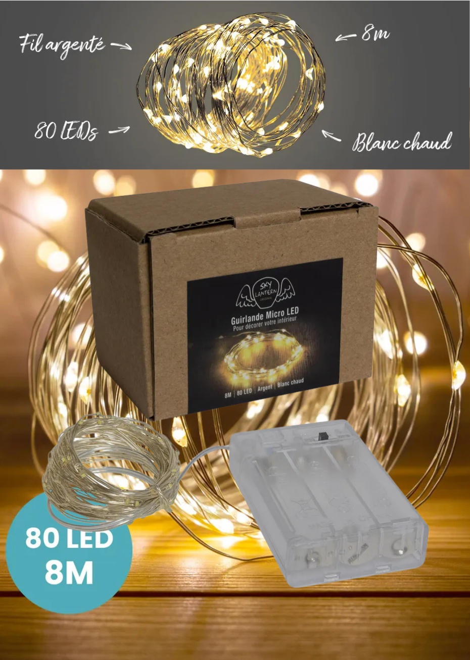 Guirlande micro led – 80 leds blanc chaud sur fil d’argent ✨