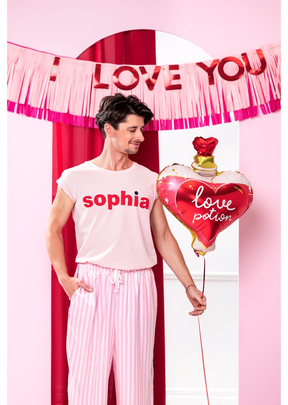Cette guirlande I Love You est une bannière à franges roses avec lettres rouges visibles au centre. Le format 150 x 30 cm permet une installation sur un mur, une porte ou un fond photo. La structure légère se suspend facilement et convient à une décoration romantique ou festive.