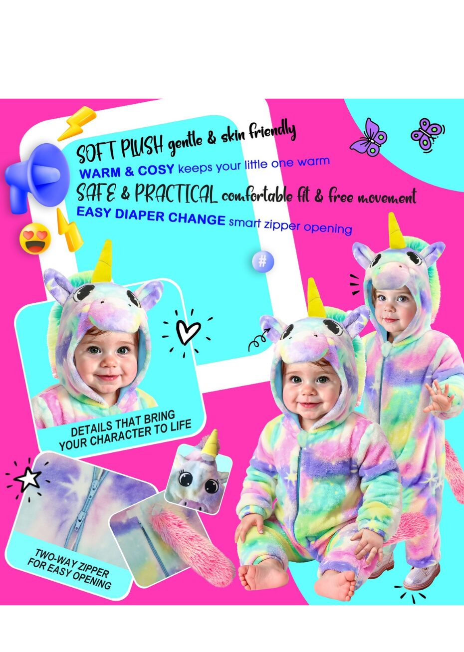 Ce déguisement de licorne multicolore pour bébé se compose d’une tenue toute douce aux couleurs pastel avec motifs étoilés, capuche intégrée avec une corne et des oreilles, une queue amovible et un zip double sens pour faciliter le change. Ce costume est parfait pour transformer votre enfant en adorable créature féerique pour un carnaval de crèche, un anniversaire ou une fête costumée.