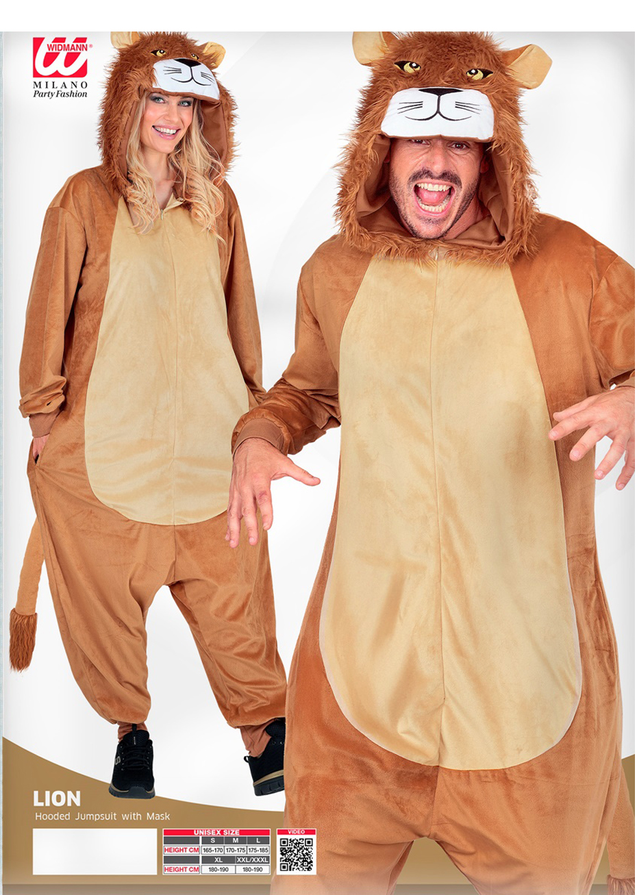 Ce déguisement de lion est une combinaison ample et douce avec capuche intégrant le visage du lion et une crinière en fausse fourrure. Le ventre clair contraste avec le reste de la tenue, et la queue est terminée par un pompon. La coupe large est confortable et permet de bouger facilement. Ce déguisement est parfait pour incarner le Roi des Animaux, pour une soirée à thème ou un évènement déguisé.