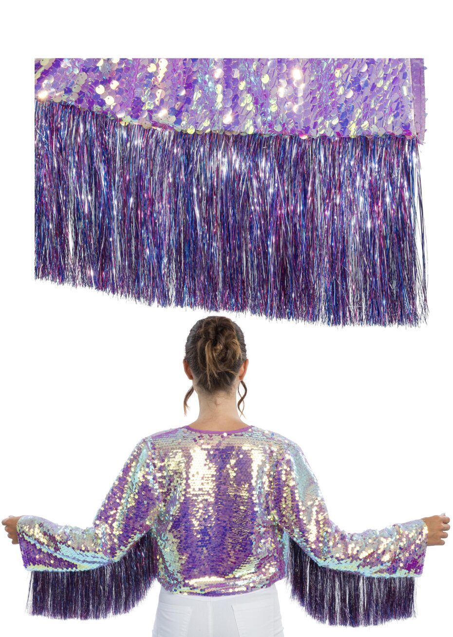 Veste sequins holographique à franges courte et ouverte, entièrement recouverte de sequins aux nuances violettes et pastel. De longues franges brillantes soulignent les manches et créent un joli mouvement. Coupe droite facile à superposer sur un top, un body ou une brassière, parfaite pour composer une tenue de festival, une soirée disco ou un look de scène inspiré des années 90 et 2000.