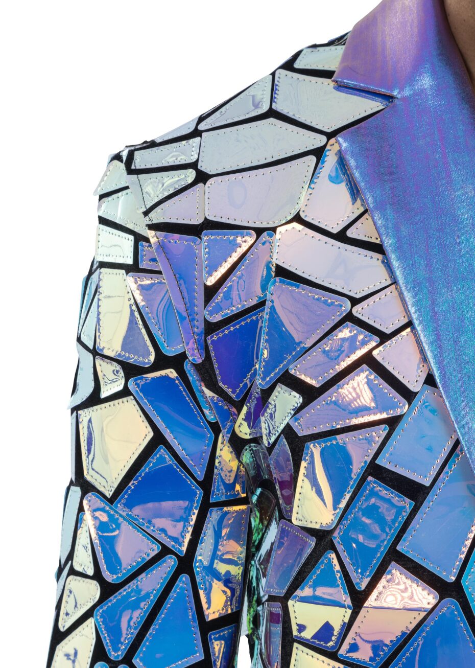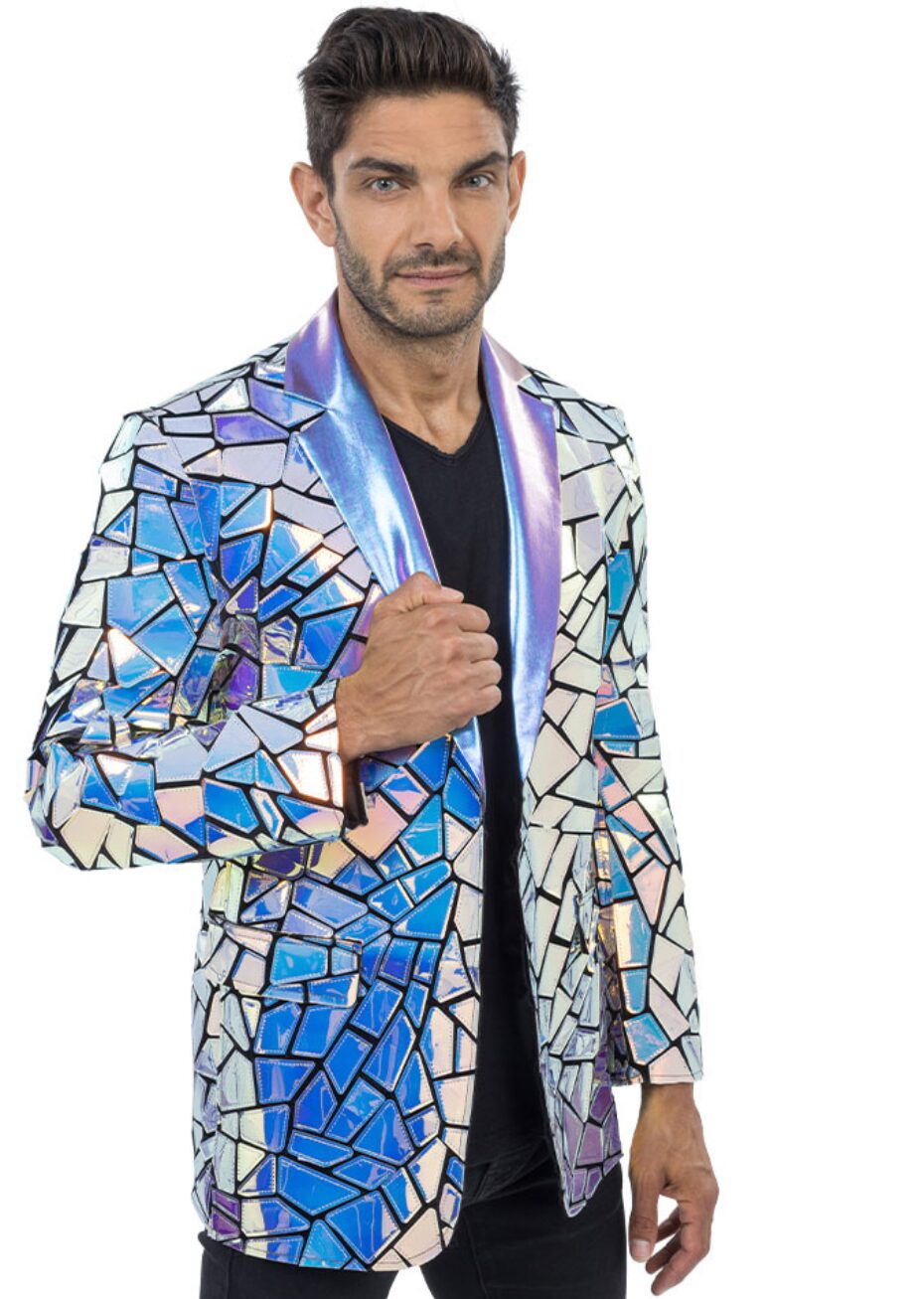 Veste holographique pour homme à effet mosaïque miroir, idéale pour une tenue spectaculaire en festival ou pour une soirée à thème. Ses panneaux aux reflets bleu, argent et violet sont inspirés des univers futuristes, années 2000 et électro. Le col satiné irisé, la coupe structurée et les finitions top qualité donnent à ce modèle un style affirmé, parfait pour se démarquer lors d’un événement festif.