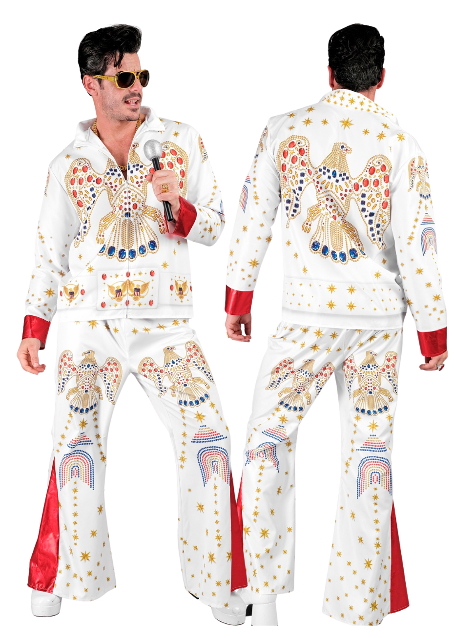 Ce déguisement Elvis est un ensemble léger composé d’un haut et d’un bas imprimés. Le motif reprend les codes des tenues de scène emblématiques : fond blanc, aigle stylisé, touches rouges et bleues, et détails dorés. Le costume se porte facilement et permet de créer un look inspiré de l’artiste sans accessoires complexes. Idéal pour une soirée années 60 ou 70 ou une fête musicale.
