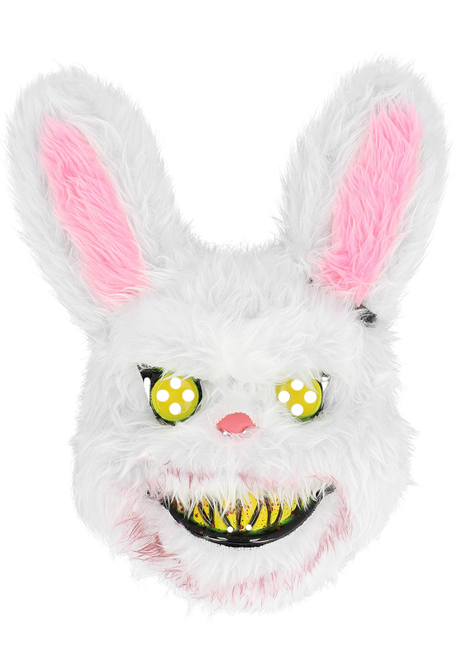 Le masque de lapin Bloody Rabbit combine un look à la fois inoffensif et terrifiant. Recouvert de fausse fourrure blanche et rose en peluche, il cache un visage inquiétant avec des yeux jaunes perforés et un large sourire effrayant. Léger et facile à porter, il s’attache à l’arrière de la tête par un élastique. Un accessoire parfait pour Halloween ou une soirée costumée à thème macabre.