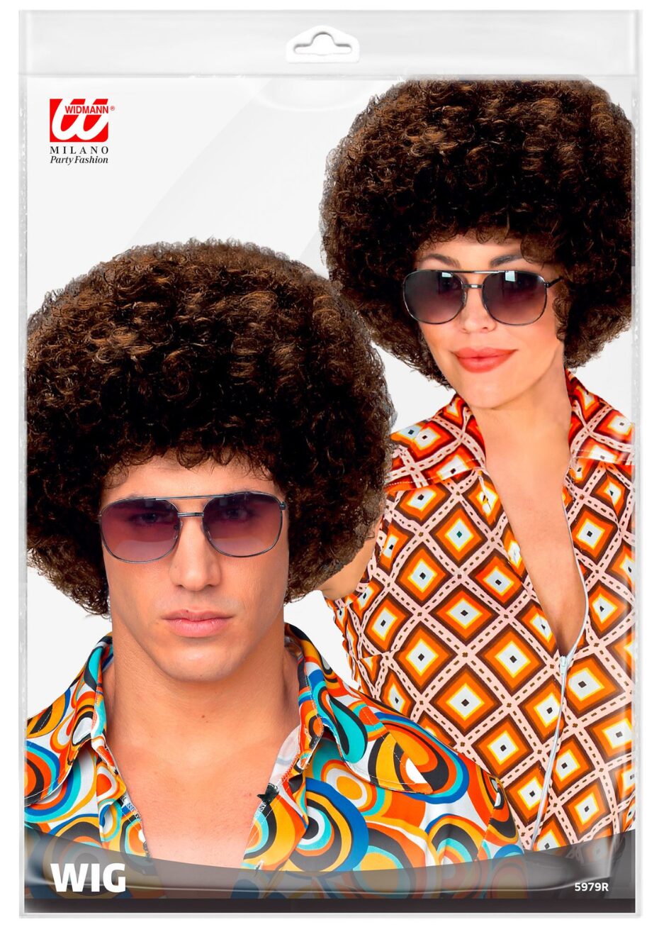Cette perruque typique des looks Années 70 et Disco est une perruque Afro courte châtain aux boucles bien serrées. Elle complète parfaitement un déguisement pour une soirée à thème Années 70 ou Disco, pour un évènement déguisé vintage. Mixte hommes et femmes, la perruque afro convient à tous les visages.