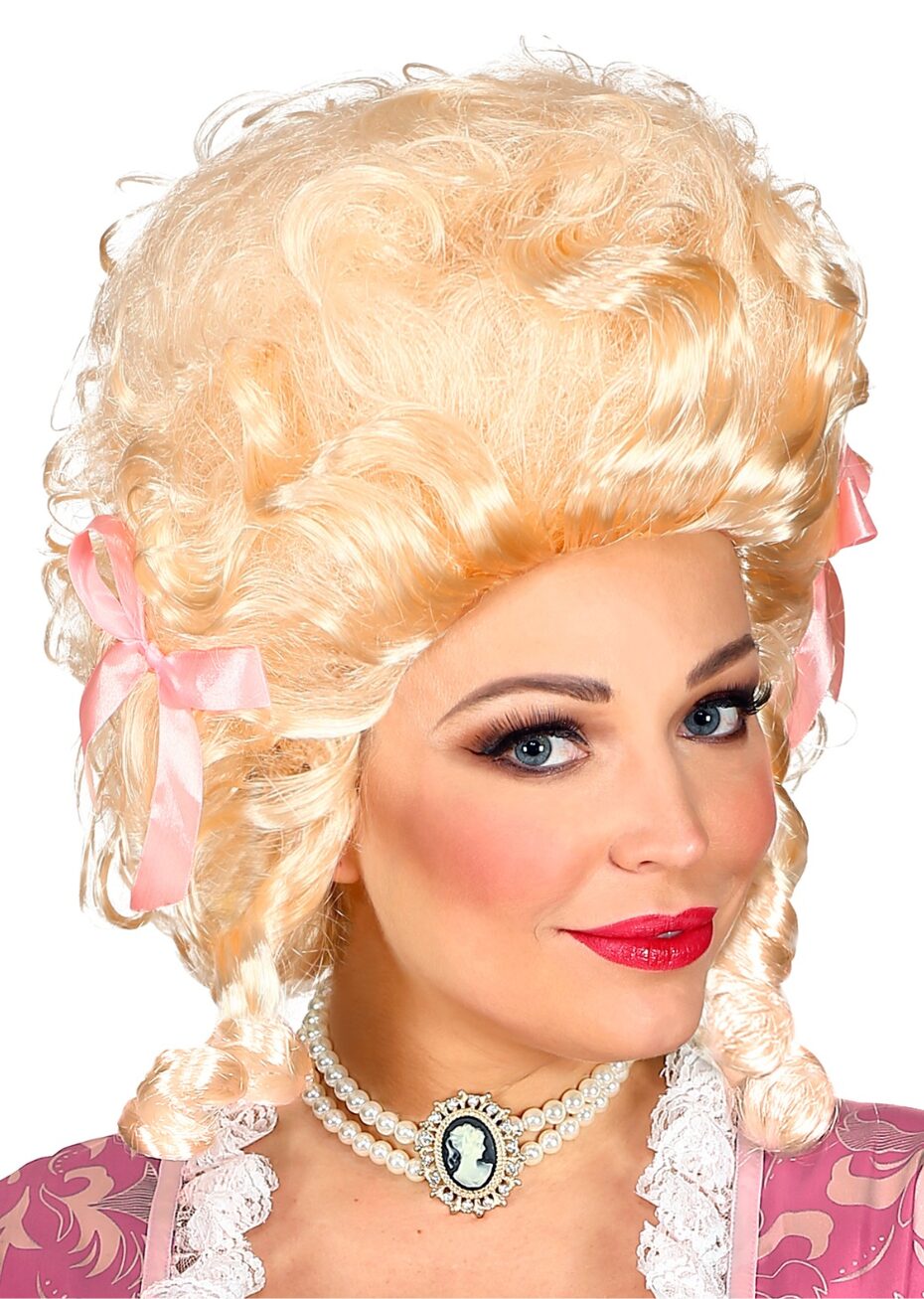 Cette perruque de marquise blonde se compose de boucles volumineuses et de mèches bouclées tombant jusqu’à la nuque. Son blond clair poudré, rehaussé de petits noeuds roses, rappelle les perruques luxueuses des nobles du XVIIIe siècle. Cette perruque apportera charme et élégance à un costume de Cour, pour une soirée à thème ou un évènement déguisé.
