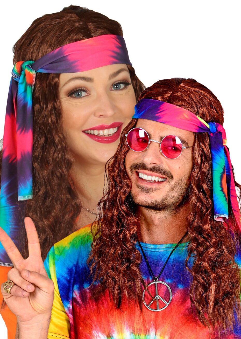 Cette perruque de hippie châtain se compose de longs cheveux gaufrés, et d’un bandeau coloré à nouer autour de la tête. Son style Années 70 convient aux hommes et aux femmes pour compléter un costume vintage peace and love pour une soirée à thème Hippie ou Flower Power.